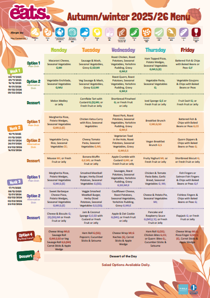 The lunch menus provided in primary schools consist of a hot two-course meal, offering a choice of main courses, vegetables, salads and desserts. They are designed to be tempting and healthy and offer choice for vegetarians with some special diets available.